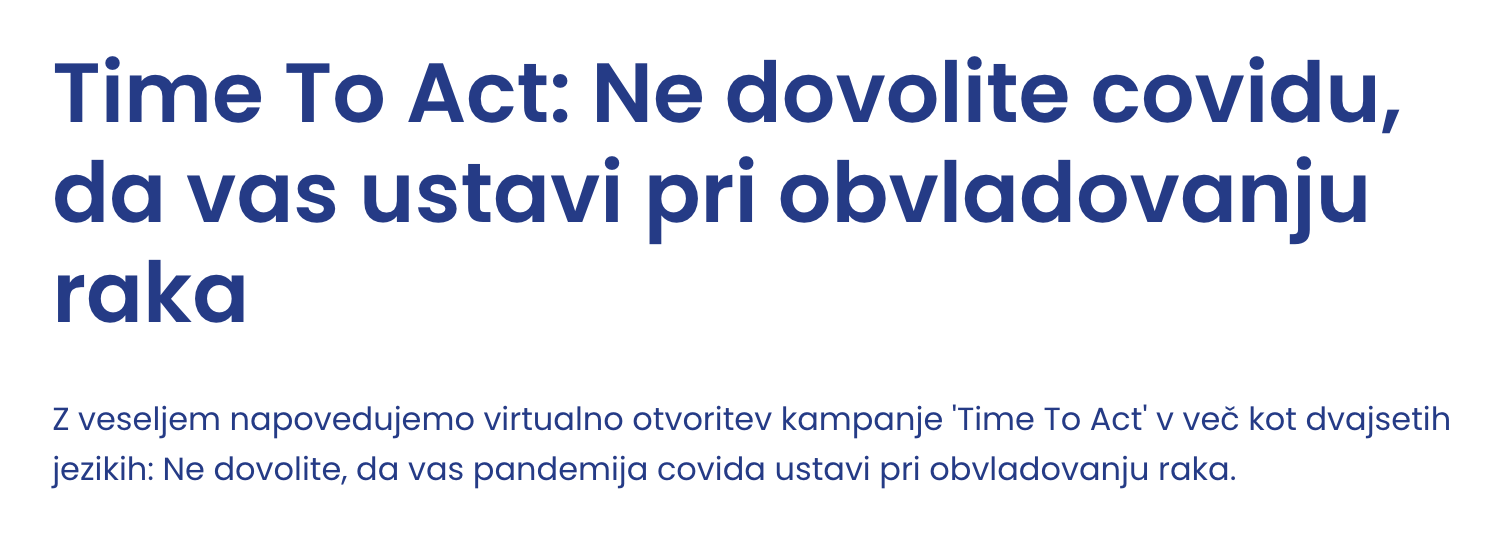 V teh dneh je Evropska organizacija za boj proti raku pod okriljem mednarodne kampanje Čas je za ukrepanje (Time To Act) predstavila podatke na ravni Evrope, ki opozarjajo na izzive, s katerimi se v času pandemije covid-19 soočajo tako posamezniki kot evropski zdravstveni sistemi. V Evropi je bilo kar milijon manj odkritih rakov in opravljenih za 100 milijonov manj pregledov v presejalnih programih za raka, kar lahko pomeni zamik pri odkrivanju raka in višje stadije ob diagnozi ter slabše preživetje bolnikov z rakom, zato pozivajo k ukrepanju. Danes v sklopu omenjene kampanje v Sloveniji poteka mednarodna konferenca pod sloganom »Ne dovolite, da vas pandemija covid-19 ustavi pri obvladovanju epidemije raka«, na kateri ključni akterji v slovenski onkologiji razpravljajo o preventivi, diagnostiki in zdravljenju raka v Sloveniji v času pandemije covid-19. Po podatkih Registra raka RS so številke zaskrbljujoče tudi v Sloveniji, kjer odkrivamo 10 % manj novih rakov kot v obdobju pred epidemijo. Zadovoljni pa smo lahko, da onkološka zdravstvena dejavnost ves čas pandemije poteka neprekinjeno, prav tako je v primerjavi z Evropo v Sloveniji situacija na področju zgodnjega odkrivanja raka v presejalnih programih bistveno boljša. Vsi trije presejalni progami za raka ZORA, DORA in Program Svit delujejo tudi v času pandemije ter še naprej uspešno odkrivajo in zdravijo predrakave in zgodnje rakave spremembe materničnega vratu, dojke ter debelega črevesa in danke.