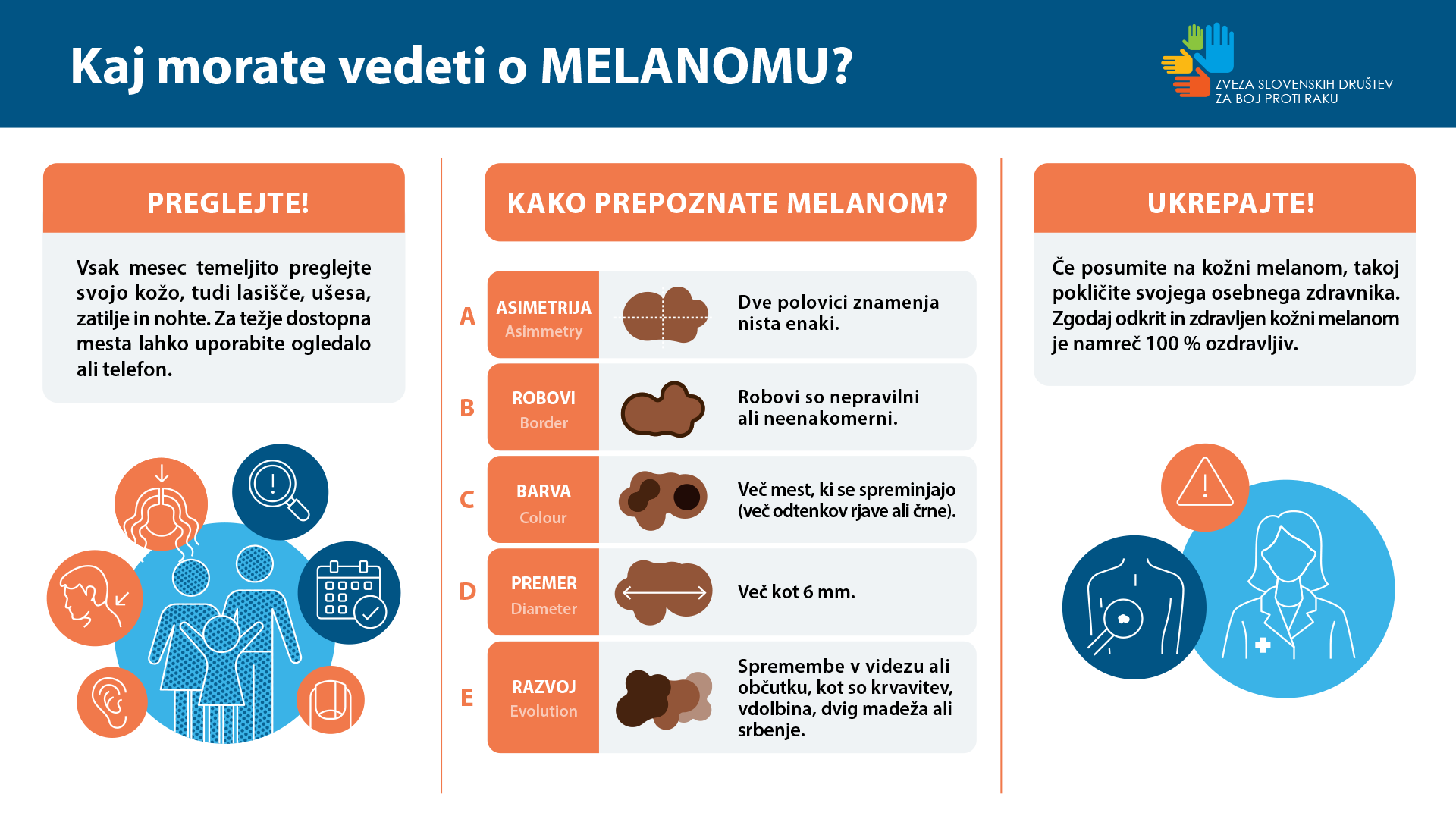 Prim. doc. dr. Tanja Planinšek Ručigaj, predstojnica Dermatovenerološke klinike UKC Ljubljana je poudarila, da lahko tveganje za nastanek kožnega melanoma in drugih vrst kožnega raka znižamo ob upoštevanju pravil varne izpostavljenosti UV-sevanju, pri čemer je pomembno, da se izogibamo soncu v času med 10. in 16. uro, spremljamo UV-indeks, se zaščitimo z oblačili, pokrivali, sončnimi očali, nanašanjem pripravkov za zaščito pred soncem z zaščitnim faktorjem 50 (ne pa manj kot 30) vsaki 2 uri na izpostavljeno kožo ter popolno opustitvijo uporabe solarijev. »Eden izmed preventivnih ukrepov je tudi zgodnje odkrivanje kožnih sprememb, zato je potrebno samopregledovanje kožnih znamenj preko načina ABCDE ter tudi redni dermatološki pregledi kože, kar je še posebej pomembno pri ljudeh z večjim tveganjem za kožni melanom, to so predvsem svetlolasi in pegasti rdečelasci,« je še dodala doc. dr. Planinšek Ručigaj. Znanje Slovencev o dejavnikih tveganja za nastanek kožnega raka je pomanjkljivo, predvsem pa je slabše v primerjavi med leti 2011 in 2019. »Ugotovili smo, da so ljudje leta 2011 bolje prepoznavali dejavnike tveganja v primerjavi z letom 2019 – UV-sevanje so leta 2011 kot tvegano prepoznali v 88,3 %, leta 2019 samo v 65,3 %.«