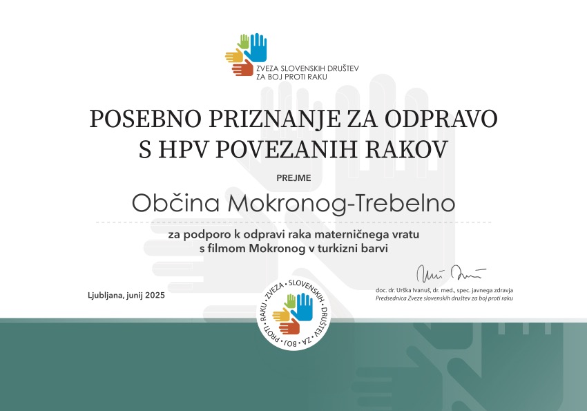 Posebno priznanje za podporo k odpravi raka materničnega vratu prejme Občina Mokronog-Trebelno za pripravo filma Mokronog v turkizni barvi, v katerega so vključili tudi lokalna bajeslovna bitja škrate Mokronožce.