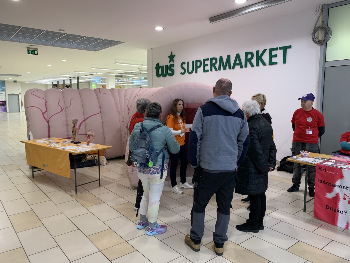 7. oktobra 2025 smo v sodelovanju s sodelavci Centra za krepitev zdravja Laško obiskovalcem trgovskega centra v Laškem predstavili pomen zgodnjega odkrivanja raka debelega črevesa in danke. Številni so si ogledali napihljiv model debelega črevesa, ki na zanimiv in poučen način prikazuje spremembe v črevesju, ter se pogovorili o pomenu redne udeležbe v Programu Svit.
