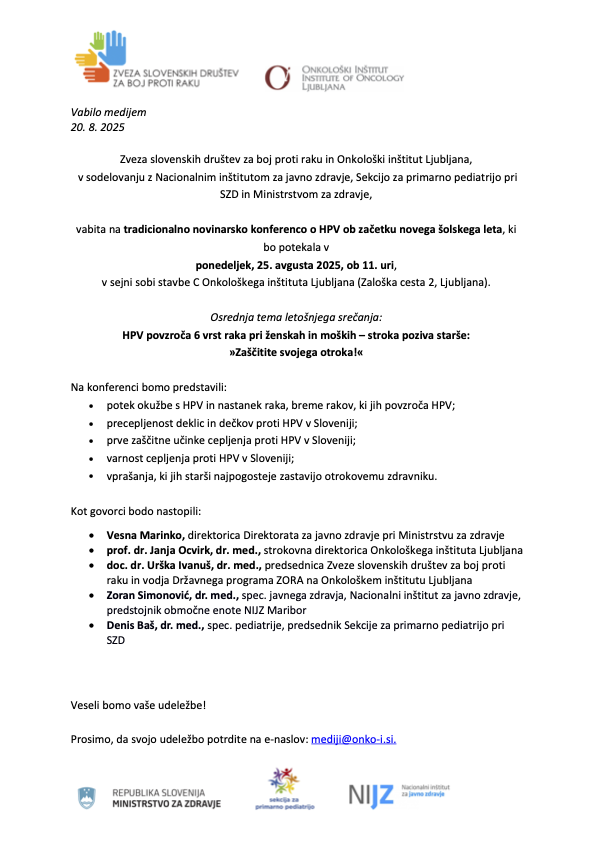 Ob začetku novega šolskega leta Zveza slovenskih društev za boj proti raku in Onkološki inštitut Ljubljana, v sodelovanju z Nacionalnim inštitutom za javno zdravje, Sekcijo za primarno pediatrijo pri SZD in Ministrstvom za zdravje, vljudno vabimo na tradicionalno novinarsko konferenco o HPV, ki bo potekala v ponedeljek, 25. avgusta, s pričetkom ob 11. uri, na Onkološkem inštitutu Ljubljana.