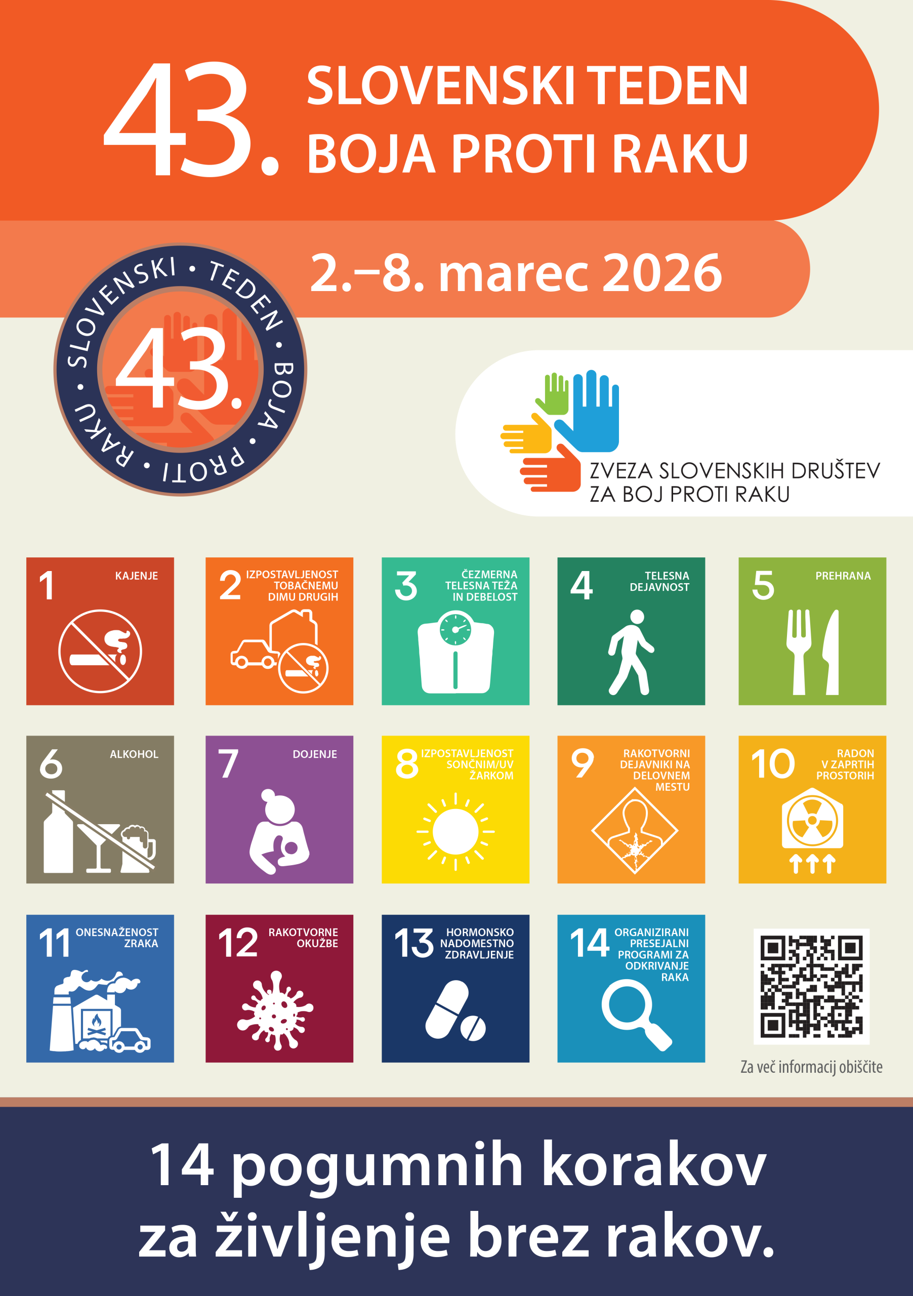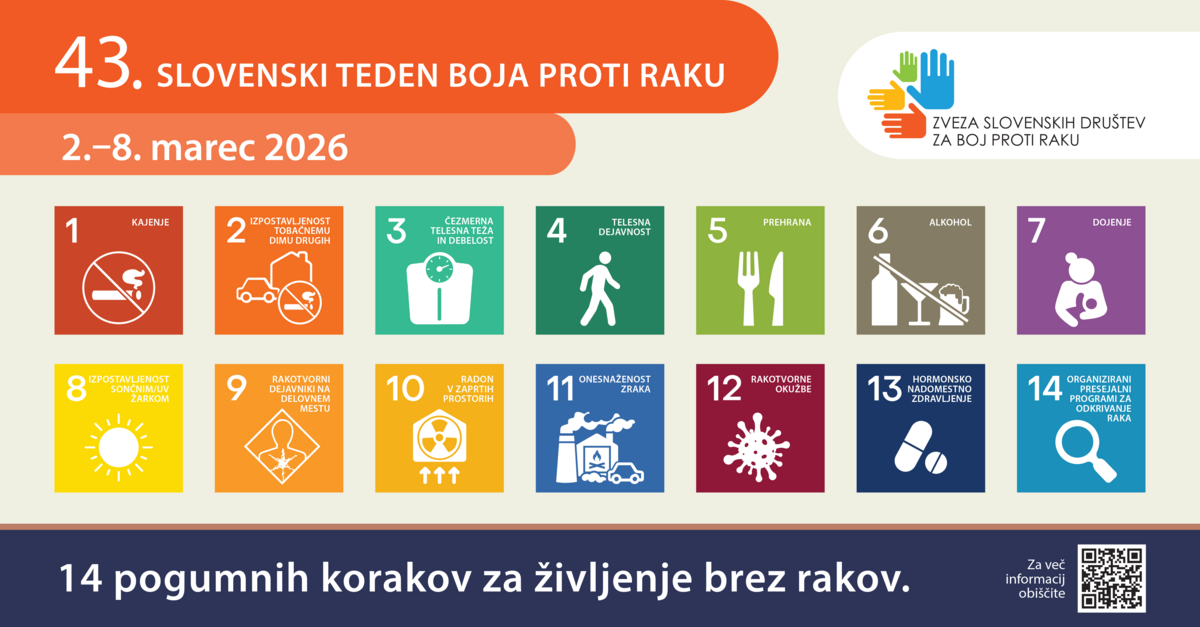 Med 2. in 8. marcem 2026 bo po vsej Sloveniji potekal 43. slovenski teden boja proti raku, letos pod geslom “14 pogumnih korakov za življenje brez rakov“.