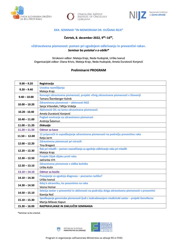Tematika letošnjega seminarja bo “Zdravstvena pismenost: pomen pri zgodnjem odkrivanju in preventivi raka.”